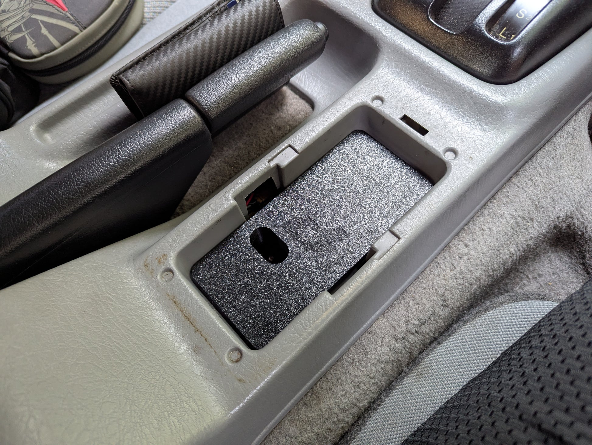 Cup holder that replaces the ash tray in the Mazda Bongo. Two pieces, one to change the sloped bottom of the ash tray holder to flat, and the cup holder itself.